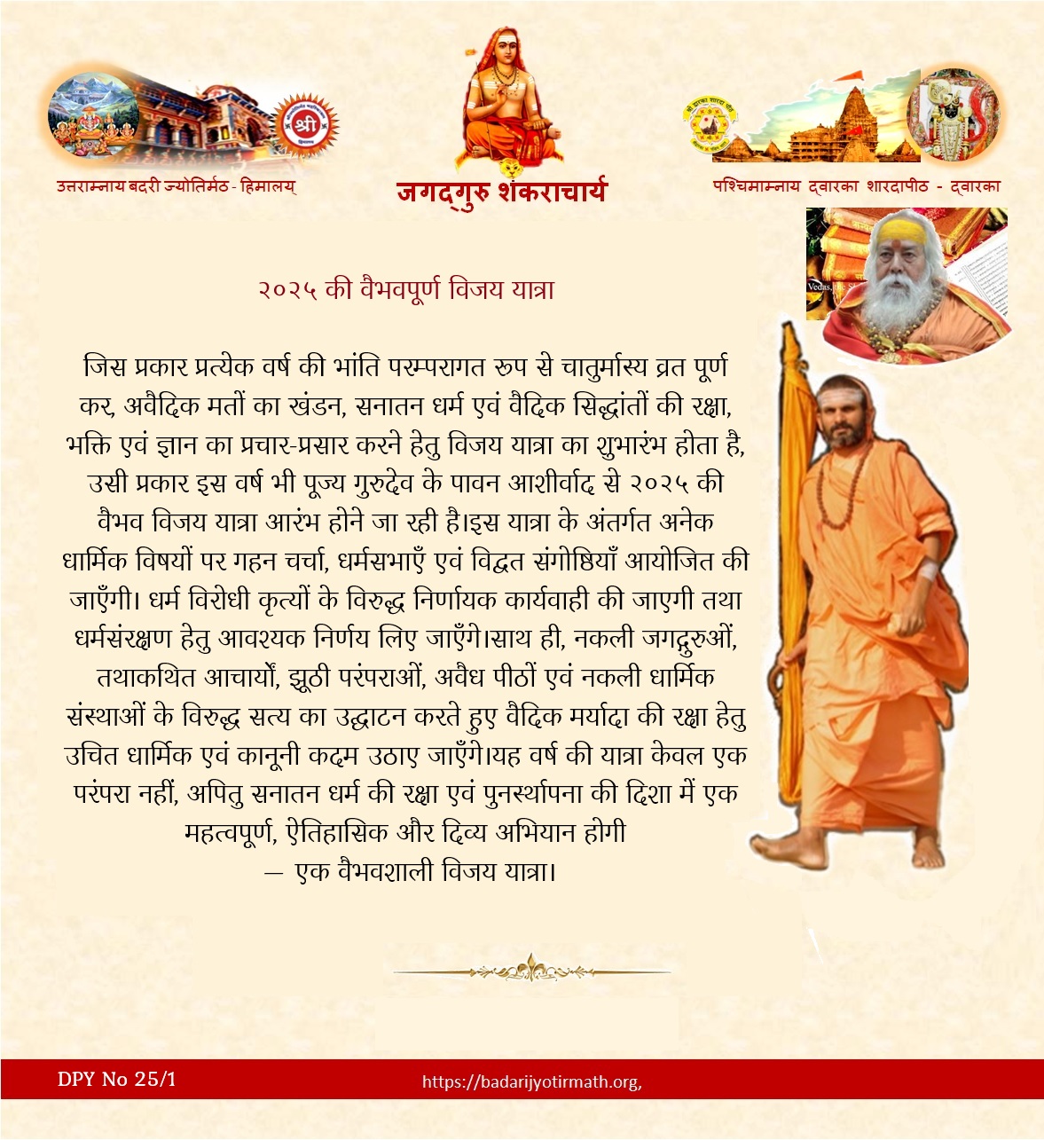जिस प्रकार प्रत्येक वर्ष की भांति परम्परागत रूप से चातुर्मास्य व्रत पूर्ण कर, अवैदिक मतों का खंडन, सनातन धर्म एवं वैदिक सिद्धांतों की रक्षा, भक्ति एवं ज्ञान का प्रचार-प्रसार करने हेतु विजय यात्रा का शुभारंभ होता है, उसी प्रकार इस वर्ष भी पूज्य गुरुदेव के पावन आशीर्वाद से २०२५ की वैभव विजय यात्रा आरंभ होने जा रही है।इस यात्रा के अंतर्गत अनेक धार्मिक विषयों पर गहन चर्चा, धर्मसभाएँ एवं विद्वत संगोष्ठियाँ आयोजित की जाएँगी। धर्म विरोधी कृत्यों के विरुद्ध निर्णायक कार्यवाही की जाएगी तथा धर्मसंरक्षण हेतु आवश्यक निर्णय लिए जाएँगे।साथ ही, नकली जगद्गुरुओं, तथाकथित आचार्यों, झूठी परंपराओं, अवैध पीठों एवं नकली धार्मिक संस्थाओं के विरुद्ध सत्य का उद्घाटन करते हुए वैदिक मर्यादा की रक्षा हेतु उचित धार्मिक एवं कानूनी कदम उठाए जाएँगे।यह वर्ष की यात्रा केवल एक परंपरा नहीं, अपितु सनातन धर्म की रक्षा एवं पुनर्स्थापना की दिशा में एक महत्वपूर्ण, ऐतिहासिक और दिव्य अभियान होगी — एक वैभवशाली विजय यात्रा।